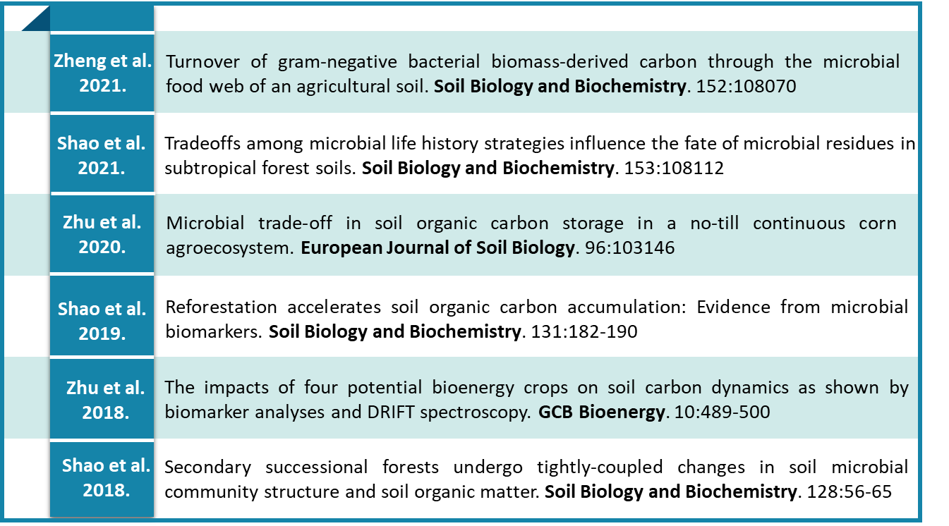 9.   Shao et al. 2019. Reforestation accelerates soil organic carbon accumulation: Evidence from microbial biomarkers. Soil Biology and Biochemistry. 2019. 131:182-190. https://doi.org/10.1016/j.soilbio.2019.01.012