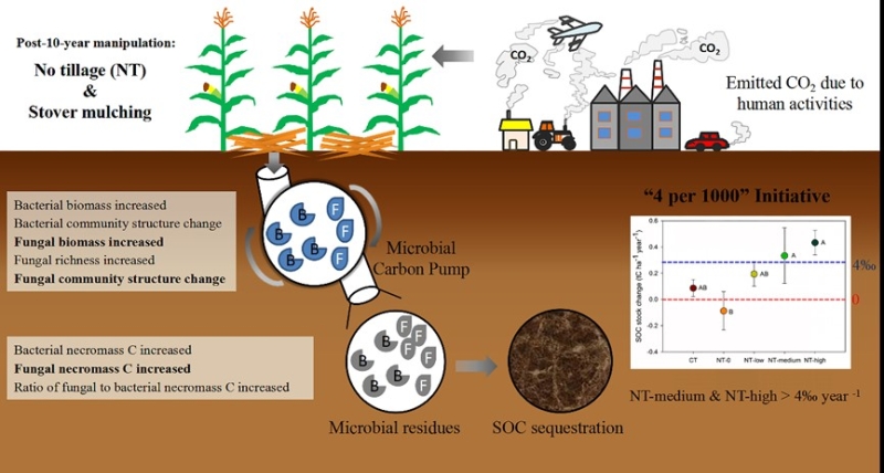 微生物残体是土壤有机碳库的重要来源,而微生物群落是控制其生成和积累的重要内在因素。然而目前尚缺乏对“农田管理措施—微生物群落特征—微生物残体碳—土壤有机碳动态”这一完整链条的研究。为此,我们分析了0-40cm土层中土壤有机碳与微生物残体碳的储量和变化,并探究了土壤有机碳动态和稳定过程与微生物群落特征的联系。研究发现,与常规耕作相比,免耕结合中量或高量秸秆还田下0-40cm土壤有机碳储量每年增加大于0.4%。保护性耕作主要通过微生物群落调控真菌残体碳来促进土壤有机碳积累,对微生物残体的研究有助于完善我们对土壤有机碳固存及其与微生物群落相关联机制的理解。免耕结合中量秸秆覆盖既可以有效地促进土壤有机碳固存,同时能将更多的秸秆用做可再生能源或畜牧饲料来增加经济价值,优化秸秆的综合利用。