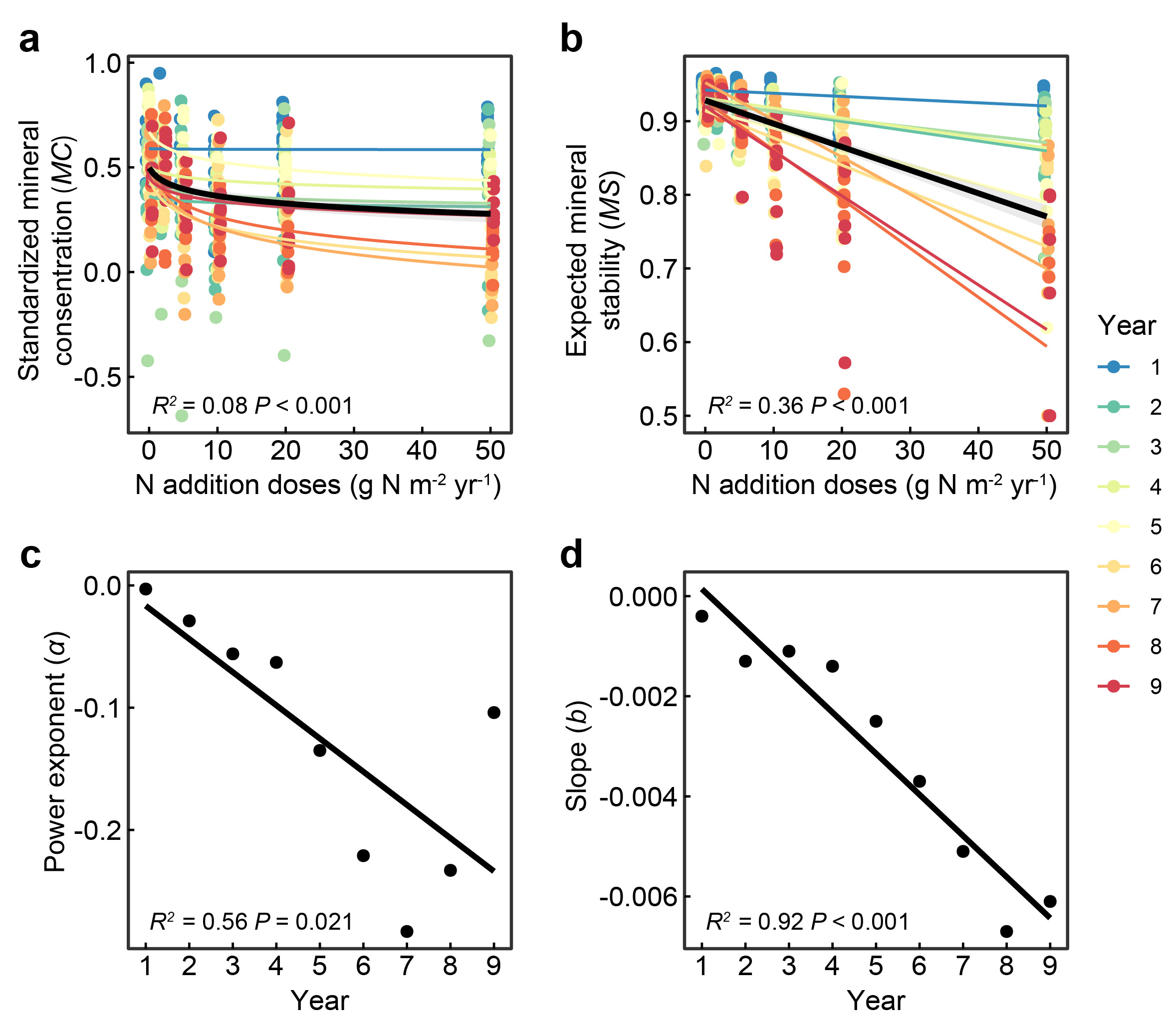 中国科学院沈阳应用生态研究所沙地和退化草地近自然恢复与多功能提升创新组群依托额尔古纳站呼伦贝尔草甸草原氮素化合物添加实验平台,开展了长达九年(2015–2023年)的野外控制试验,基于家畜矿质养分需求阈值和二分网络稳定性分析方法,系统探究了草甸草原刈割草地中牧草磷、钾、钙、镁、铁、锰、铜和锌等非氮矿质元素含量及其供给稳定性对不同氮素补给量(0、2、5、10、20 和 50 g N·m⁻²·yr⁻¹)的响应规律。研究结果显示,氮素添加显著降低了牧草的标准化非氮矿质元素的含量及其预期稳定性,并且这种负面影响随时间推移持续增强(图1)。沿氮素添加梯度,植物物种丰富度与牧草的非氮矿质浓度和供给稳定性之间呈现出正向但趋于饱和的关系(图2)。氮素补给通过降低植物物种丰富度,削弱了草地非氮矿质养分的供给能力,从而导致牧草产量与非氮矿质元素所表征的牧草品质之间呈现权衡关系(图3)。这一研究说明维持植物多样性对于保障天然草原矿质养分的稳定供给至关重要。该项研究揭示的氮素补给梯度上牧草产量与品质之间的权衡关系为刈割草地的养分管理提供了重要参考。