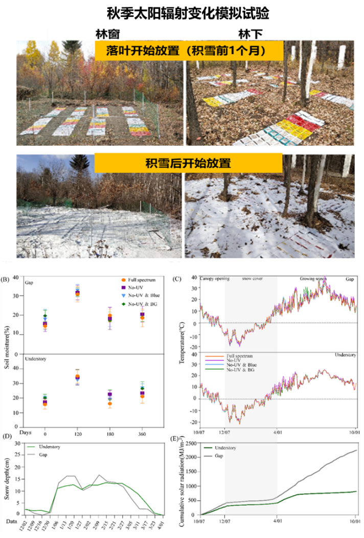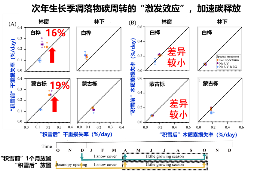 基于此,中国科学院沈阳应用生态研究所森林生态系统管理团队选择温带森林阔叶树种蒙古栎和白桦的凋落叶作为试验材料,“秋季落叶开始(积雪前一个月)”和“积雪开始”两个时间点,分别在林下和林窗处凋落物进行原位光谱滤除处理试验(图1)。结果表明,积雪前一个月的太阳辐射暴晒产生的光降解作用,对次年凋落物碳周转具有正向的遗留效应,特别是在林窗处,碳释放增加 16-19%(图2)。该研究强调气候及人为活动干扰造成的落叶期/积雪覆盖变化、冠层结构变化,能够决定森林生态系统碳收支平衡的走向未配对的括号或引号!Li et al. 2024,Ecological Processes未配对的括号或引号标点符号重复!