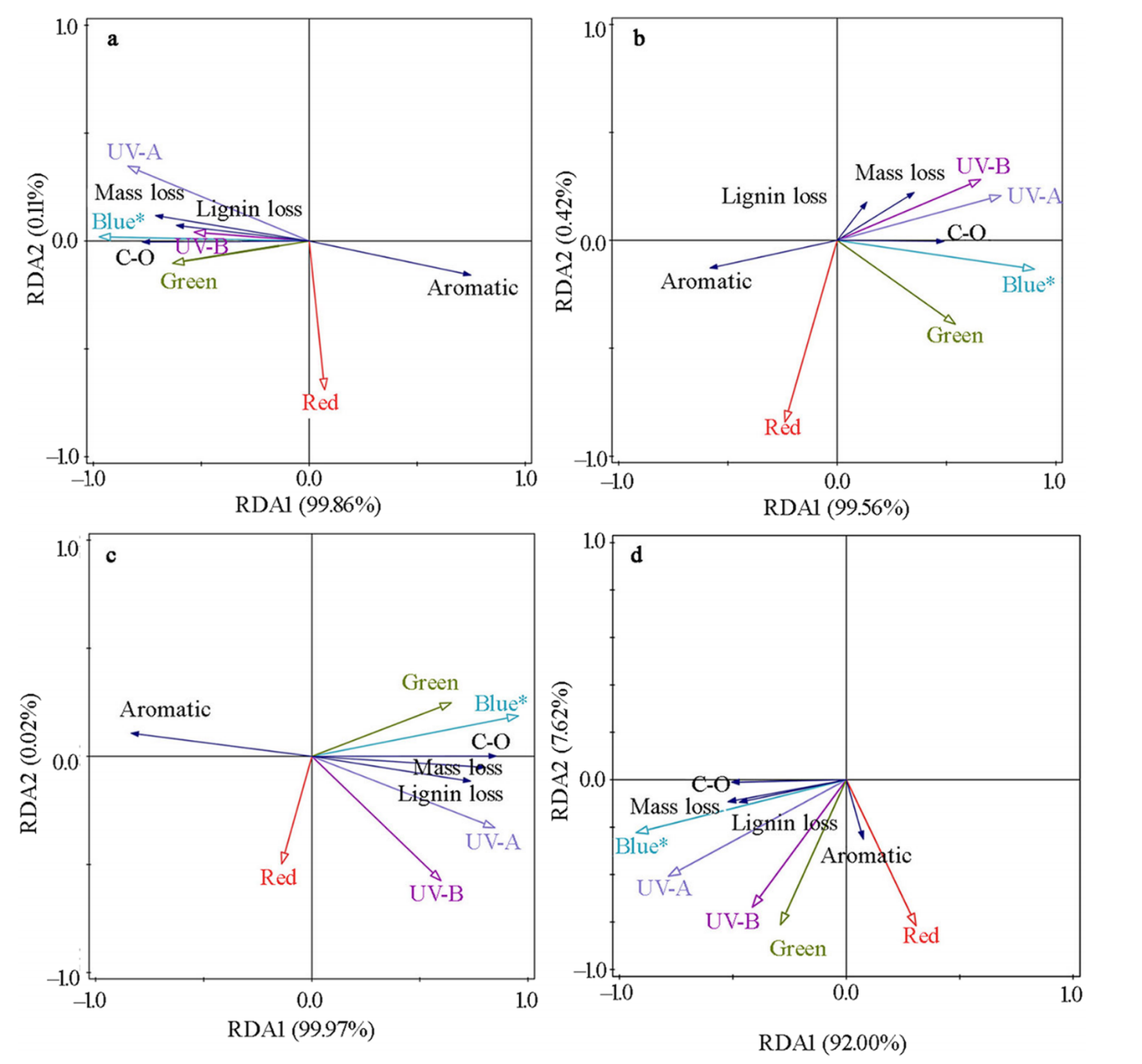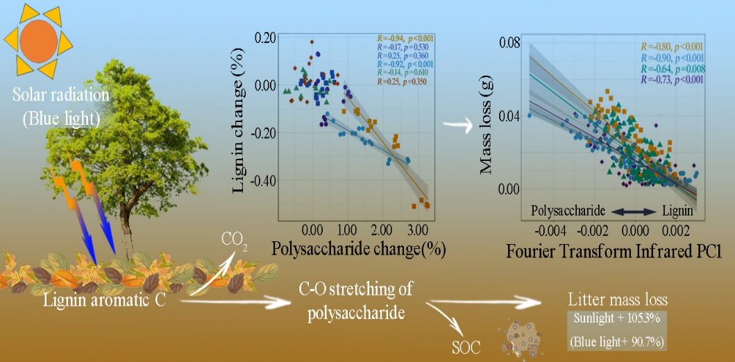 上述研究中短暂的秋季曝光产生显著的遗留效应,但是值得注意的是处理间木质素变化差异较小,为了探明这个问题,研究团队采用傅立叶变换红外光谱(FTIR)方法,分析了光降解对凋落物碳分子结构的影响。研究结果表明,太阳辐射,尤其是蓝光波段显著改变了凋落物碳分子结构,通过直接降解大分子木质素芳香族碳,降解为可溶性有机碳,增加多糖可用性,促进淋洗及微生物分解,一定程度上解释了光降解的作用机制(图3,4)。该研究预测在未来气候或人为干扰加剧下,大量的太阳辐射通过破坏的森林冠层或林窗到达地表凋落物层,其光降解作用会产生更多易降解光产物并输入至地下,造成土壤碳库的稳定性降低,减弱森林生态系统碳汇功能(Chang et al. 2025 ,Journal of Forestry Research)。