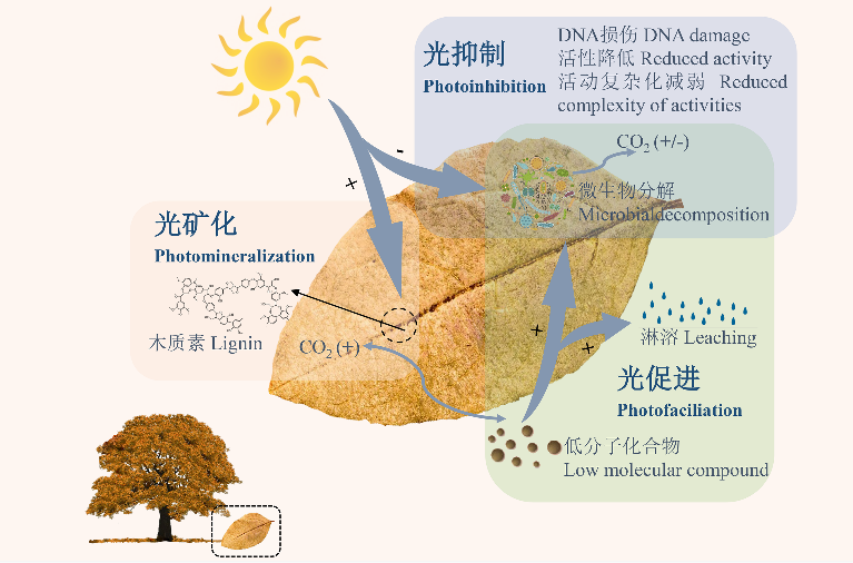 为了丰富和发展凋落物分解理论,研究团队综述了光降解的作用机理,主要包括光矿化、光抑制和光促进效应,并归纳了其主要驱动因素,比较了不同尺度上凋落物光降解对环境及气候变化的响应差异(图5)。光降解对凋落物分解的影响程度与太阳辐射特征、凋落物性状、温度、水分、微生物和植被覆盖等因素密切相关,多因素之间的相互作用使得光降解作用更加复杂。最后,甄别了凋落物光降解研究中存在的主要问题,展望了未来的研究方向,着重强调需要深入探究光降解作用途径及其内在机制,量化光降解与环境因子交互效应,并对传统碳周转模型进行优化(张娟娟等. 2024 ,应用生态学报)。