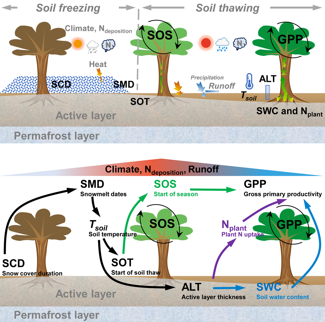 基于多源遥感数据融合,中国科学院沈阳应用生态研究所森林生态系统管理组陈宁副研究员联合国内外多家科研团队,系统解析了北方多年冻土区植被生产力对积雪减少的响应过程与内在机制。结果显示,积雪减少年份生长季初期土壤温度呈上升趋势。“温暖”土壤地区的植被生产力显著增加;而“寒冷”土壤地区则降低。植被生产力增加主要归因于积雪覆盖期缩短与融雪期提前,这一过程增强了春季土壤的热量吸收,促使多年冻土开始融化时间提前并增加活动层深度,进而改善了植物可利用的水分与养分条件以及提前春季植被返青期(图1)。据此,本研究凝练出积雪减少通过加速多年冻土退化而改变氮、水循环过程,进而构建了影响植被动态的三条途径:1、“SOS”途径—提前春季植被返青;2、“SWC”途径—增加植被土壤水分可利用性;3、“N-uptake”途径—提升植被氮吸收。