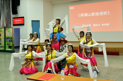 在农业支部的朱雪峰独唱《天耀中华》之后,环境支部和信息编辑开发支部合唱了《中国,中国,鲜红的太阳永不落》和《歌唱祖国》。离退休支部的老党员穿起藏族的传统服装,甩起长袖,带来了舞蹈《再唱山歌给党听》。 最后,研究生总支表演了大合唱《共筑中国梦》,给整场文艺汇演画上了完美的句号。