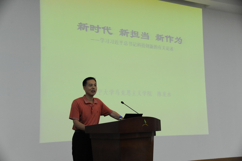 报告中,陈发水老师首先分析了习近平科技创新思想形成的历史背景,他认为习近平科技创新思想是基于世界历史与近代中国屈辱历史深刻反思的结果,是捍卫国家主权的客观需要,是综合国力的重要显示度的表现,也是实现“两个一百年”奋斗目标的客观要求。随后他阐述了习近平科技创新思想的主要内容,包含创新是引领发展的第一动力;实施创新驱动发展战略,推进以科技创新为核心的全面创新;.科技创新是提高社会生产力和综合国力的战略支撑;坚定不移走中国特色自主创新道路;加快科技体制改革步伐;牢牢把握科技进步大方向;牢牢把握产业革命大趋势;牢牢把握集聚人才大举措等八个方面。报告最后,陈老师讲述了新近印发的《关于进一步激励广大干部新时代新担当新作为的意见》的主要内容,包括大力教育引导干部担当作为、干事创业,鲜明树立重实干重实绩的用人导向,充分发挥干部考核评价的激励鞭策作用,切实为敢于担当的干部撑腰鼓劲,着力增强干部适应新时代发展要求的本领能力,满怀热情关心关爱干部,凝聚形成创新创业的强大合力等建立激励机制和容错纠错机制的七个举措。陈老师的报告主题鲜明,紧跟大局、逻辑清晰、论证深入,具有很强的理论性、政策性和针对性,对我们深入学习领会习近平科技创新思想,对贯彻落实《关于进一步激励广大干部新时代新担当新作为的意见》有积极意义。