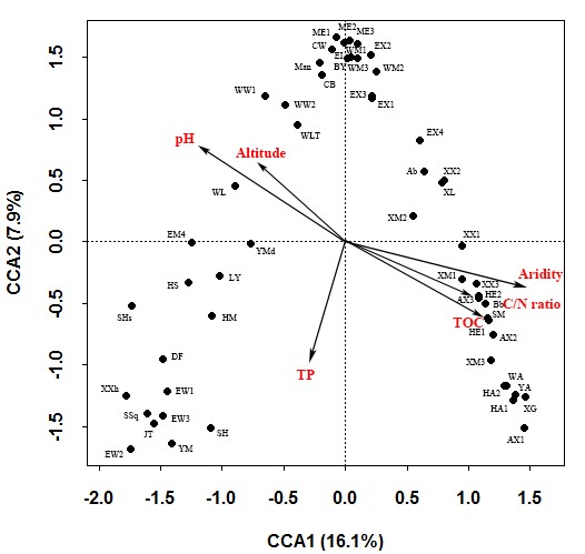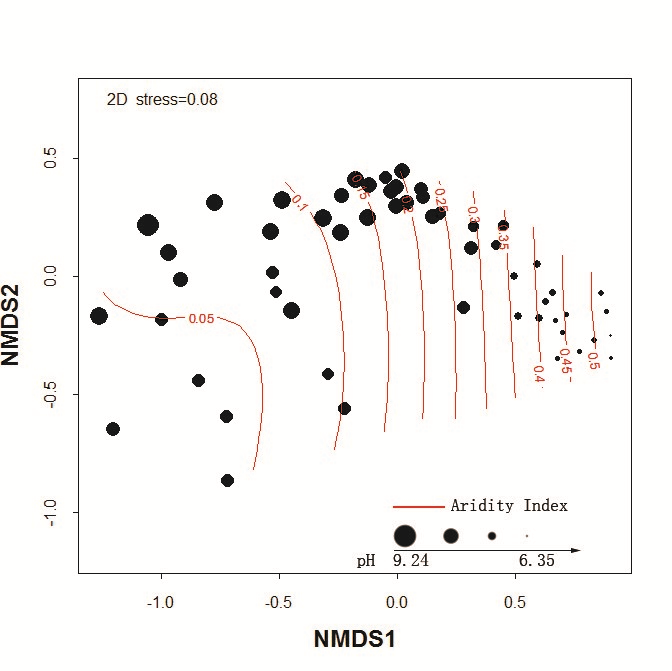 动植物多样性沿降水梯度的格局变化已被广泛研究,但是降雨以何种程度又如何影响微生物多样性的生物地理分布还鲜有研究。依托我国北方草地3700 km的样带调查研究,我们通过细菌16S rRNA基因测序分析了细菌多样性、群落组成的空间分布规律及其驱动因素。研究发现:(1)在我国北方干旱和半干旱草原,放线菌门、酸杆菌门、α-变形菌门、δ-变形菌门、拟杆菌门和浮霉菌门是细菌主要的6个优势类群。(2)干燥度(MAP/MAT)是影响细菌群落多样性和群落组成最显著的环境因子。在越干旱的地区,细菌多样性越低,但是多样性存在较大的空间变异。(3)干燥度也是影响细菌优势类群相对丰度最重要的环境因子,细菌优势门丰度随干燥度梯度的变化呈现不同的响应趋势。(4)细菌物种丰富度格局与植物不同,但呈现与大型生物相似的地方性。(5)细菌群落相似性随地理距离和环境距离显著降低,相对于环境因子,地理距离也是影响微生物群落组成的另一重要因素。(6)地理距离较环境因子能解释更多的细菌群落的空间变异,随着研究尺度的加大,其对微生物群落空间分布的影响可能会更为明显。说明在干旱和半干旱草原微生物群落组成和多样性格局由历史因素(如扩散限制)和当代环境异质性两者共同驱动。以上结果发表在FEMS Microbiology Ecology上。