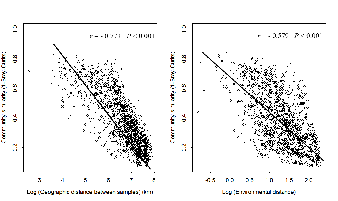 图 4 细菌群落相似性与地理距离和环境距离的衰减关系