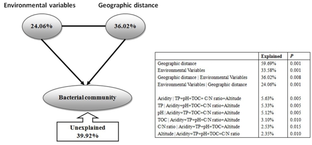 图 5地理距离和环境变量对细菌群落结构影响的VPA(Variation partition analysis)分析