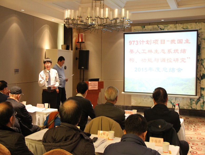 2015年11月25-26日,由中国科学院沈阳应用生态研究所主持的国家重点基础研究发展计划(973计划)项目“我国主要人工林生态系统结构、功能与调控研究”(2012CB416900)2015年年度总结会在北京召开,会议由项目第二课题(罗志斌教授所在的西北农林科技大学)承办。973计划顾问组专家孙鸿烈院士,咨询组跟踪专家:蔡运龙教授、李锐研究员、尚金城教授,项目专家组:傅伯杰院士、刘世荣研究员、杨传平教授、薛建辉教授、韩兴国研究员、姜凤岐研究员、赵士洞研究员、朱教君研究员,同行专家:于贵瑞研究员、金昌杰研究员、韦革宏教授,科技部基础研究管理中心吴根处长、中国科学院前沿科学与教育局张鸿翔处长、段晓男副处长、中国科学院科技促进发展局杨萍主任、西北农林科技大学科研院孙楠处长、中国科学院沈阳应用生态研究所科技处卓君臣处长及课题负责人、骨干共100余人出席了会议。