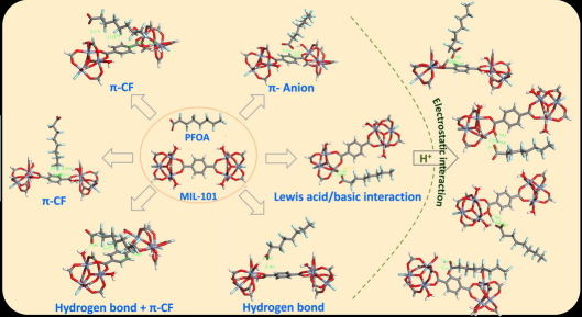 发现MIL-101及其有机配体改性材料对离子型污染物全氟辛酸(PFOA)具有比传统吸附剂更强的吸附能力。研究中使用密度泛函理论方法揭示MIL-101对PFOA的吸附机制,从而为研发具有更强吸附能力的MOF材料奠定基础。 (ES&T, 2015)