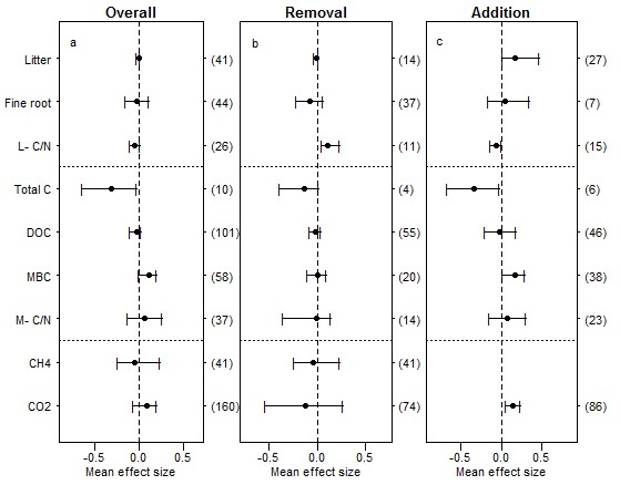 基于此,中国科学院沈阳应用生态研究所生态气候组博士研究生李伟斌在金昌杰研究员的指导下,与其他合作作者通过运用整合分析(Meta-analysis)的方法系统的探讨了积雪变化对陆地生态系统碳、氮库及其动态的影响,并综合评价了不同实验方法与研究时间长短的利弊。研究结果表明(如图):