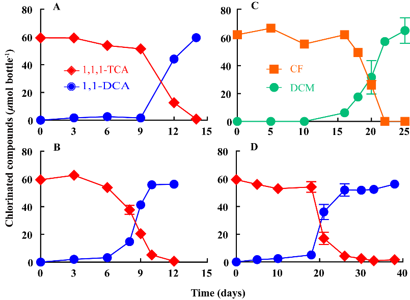 图1. 1,1,1-三氯乙烷和氯仿的还原脱氯 (A) 1,1,1-三氯乙烷第6代富集培养 (B) 1,1,1-三氯乙烷第12代富集培养 (C) 氯仿第6代富集培养 (D) 乙酸作碳源的1,1,1-三氯乙烷第6代富集培养