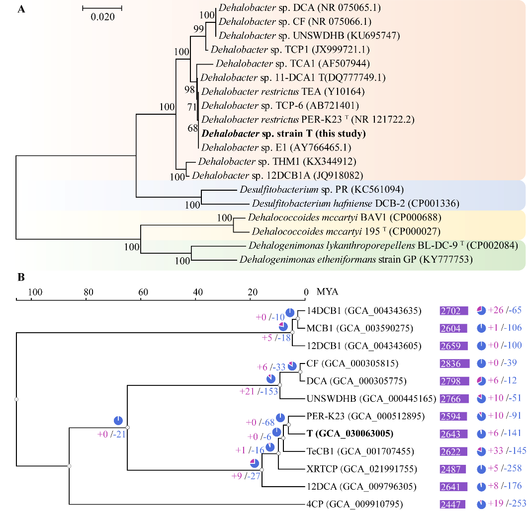 图4. 基于16S rRNA 基因(A)与基因组序列(B)的系统发育分析