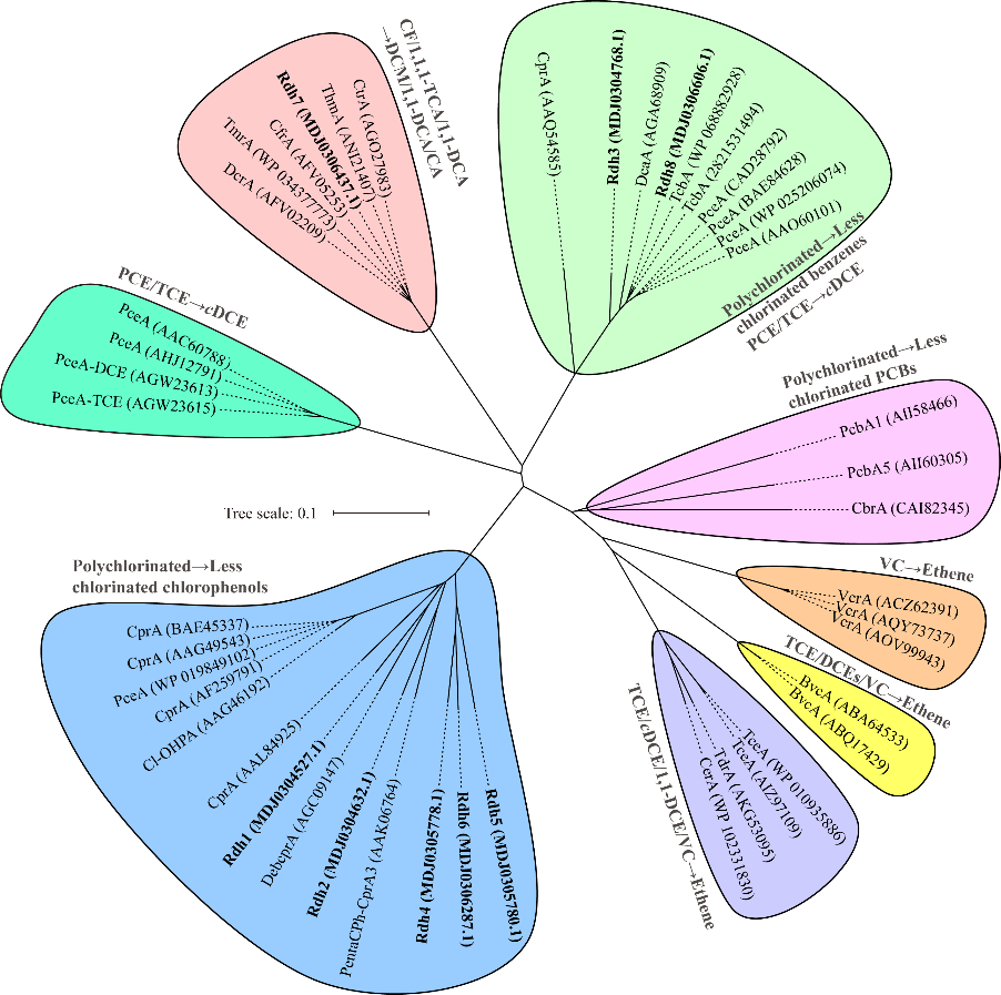 中国科学院沈阳应用生态研究所污染环境微生物生态组研究团队在有机氯污染微生物修复领域取得重要突破。该团队以辽宁沈阳细河沉积物为研究对象,成功构建了稳定的1,1,1-三氯乙烷脱氯富集培养体系。经过连续传代培养,研究团队观察到体系脱氯速率显著提升,并成功富集到高丰度的脱卤杆菌(Dehalobacter)。深入研究发现,该富集培养体系不仅能够将1,1,1-三氯乙烷转化为1,1-二氯乙烷,还展现出对氯仿、1,1,2-三氯乙烷和1,2,4-三氯苯等多种有机氯化物的脱氯能力。qPCR定量分析证实,脱卤杆菌的生长与这些有机氯化物的还原脱氯过程紧密耦合。基于其独特的代谢特性,研究团队将该菌株命名为Dehalobacter sp. strain T。通过整合蛋白质组学和宏基因组学分析,研究人员成功鉴定出关键脱卤酶TcaA。该酶在1,1,1-三氯乙烷和氯仿脱氯过程中呈现高表达特征,其氨基酸序列与已知CfrA-like脱卤酶的相似性高达94.7%-96.7%。基因组学分析发现,T菌株还编码一种TcbA-like还原脱卤酶,该酶与已报道的1,2,4-三氯苯脱卤酶的相似性达95%,可能是驱动1,2,4-三氯苯脱氯过程的关键酶。研究团队还通过扩增子测序和宏基因组分析,深入解析了T菌株与其他微生物群落的代谢互作网络,揭示了重要的代谢途径和潜在的种间代谢物转移机制。系统进化与比较基因组分析表明,脱卤杆菌T菌株呈现出明显的基因家族收缩特征和基因缺失现象,这可能是其与体系中其它微生物形成协同代谢关系的重要基础。该研究成果不仅为深入理解脱卤杆菌的生态功能和进化机制提供了新的理论依据,更为开发高效的微生物环境修复技术奠定了基础。随着研究的不断深入,这些"环境卫士"有望在污染治理领域发挥更大作用,为水环境安全提供有力的技术支撑。
