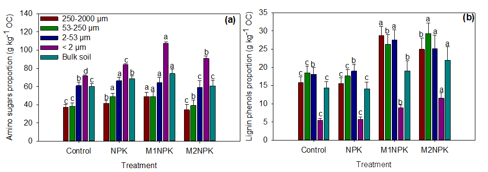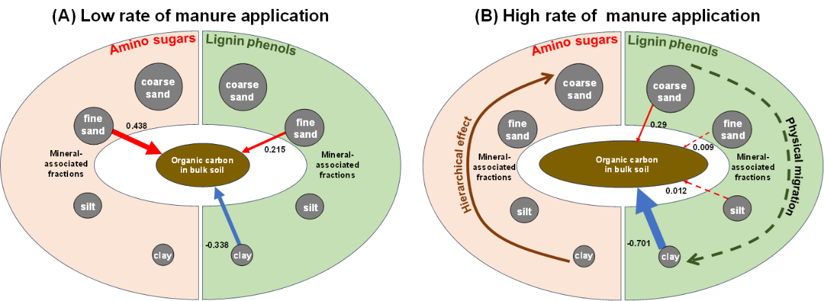 本研究基于东北黑土农田30年肥料与肥力长期定位试验,分别以氨基糖和木质素作为微生物和植物来源稳定组分标识物,利用土壤粒径分级技术研究了长期施肥对SOC、植物来源木质素及微生物残体在不同矿物粒级的动态分布的影响。研究结果显示:长期有机肥施用显著促进SOC累积,强化了木质素在砂粒级的选择性积累以及微生物残体从黏粒向砂粒的迁移转化。高量有机肥投入使氨基糖在全土和黏粒级趋于饱和,同时显著提升木质素在砂粒级的保留效率。由此可见,当黏土矿物对微生物残体的保护作用达到阈值后,土壤不同组分的存留和矿物保护解耦。微生物与植物残留组分的固有理化特性,尤其是植物残体的抗分解能力,将成为调控SOC长期积累与稳定化的主导因素。本研究成果为揭示农田生态系统碳汇形成机制、优化施肥与有机质管理策略、提升土壤碳封存效率提供了重要理论依据与实践指导,对推动农业碳中和目标实现和土壤健康可持续发展具有重要意义。