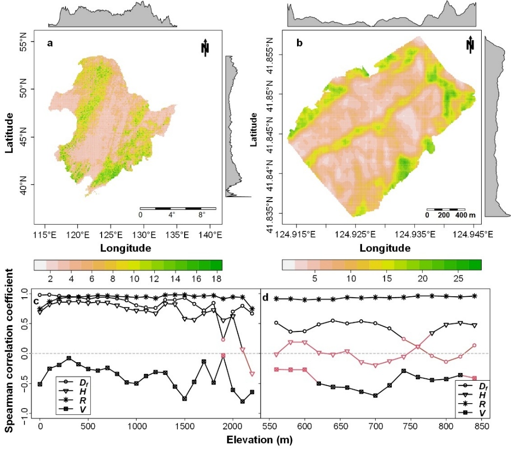 研究结果表明,Df、H、R 和 V 随海拔高度的变化受地形单元大小的影响,且具有特征特异性和尺度依赖性。这些地形特征(Df、H、R、V)随着地形单元大小增大而逐渐增大并趋于稳定。表征这些地形特征所需的最小地形单元大小随着DEM分辨率降低(从0.5 m至120 m,共10个级别)而增大,与DEM分辨率之间呈现出良好的幂函数关系(R2 ≥ 0.97)。在0.5 m和120 m分辨率的DEM下,最小地形单元大小分别为140 m×140 m和7.56 km×7.56 km。基于30 m分辨率DEM计算的地形特征,能够解释年水土流失量(ASWE)变异的7-21%以及维管植物多样性变异的9-24%。TCI对ASWE和维管植物多样性的预测R2均比单一地形特征高2-10%,其在预测复杂地形-生态相互作用的空间格局方面展现出优越的能力。该研究为量化山区等不规则地形的复杂三维结构提供了新的有效指标,为深入理解地形复杂度对山地生态系统结构与功能的影响提供了新的视角。