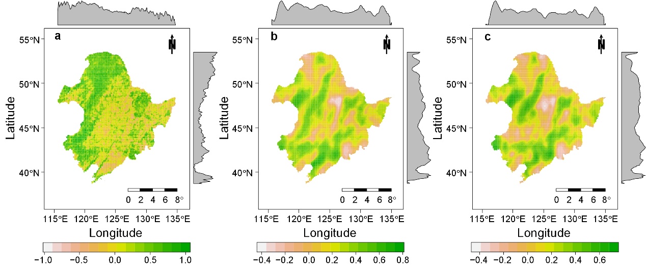图2 地形复杂度指数与不同生态变量之间局域相关性的空间分布,包括:(a)年水土流失量、(b)维管植物系统发育丰富度及(c)维管植物物种丰富度。