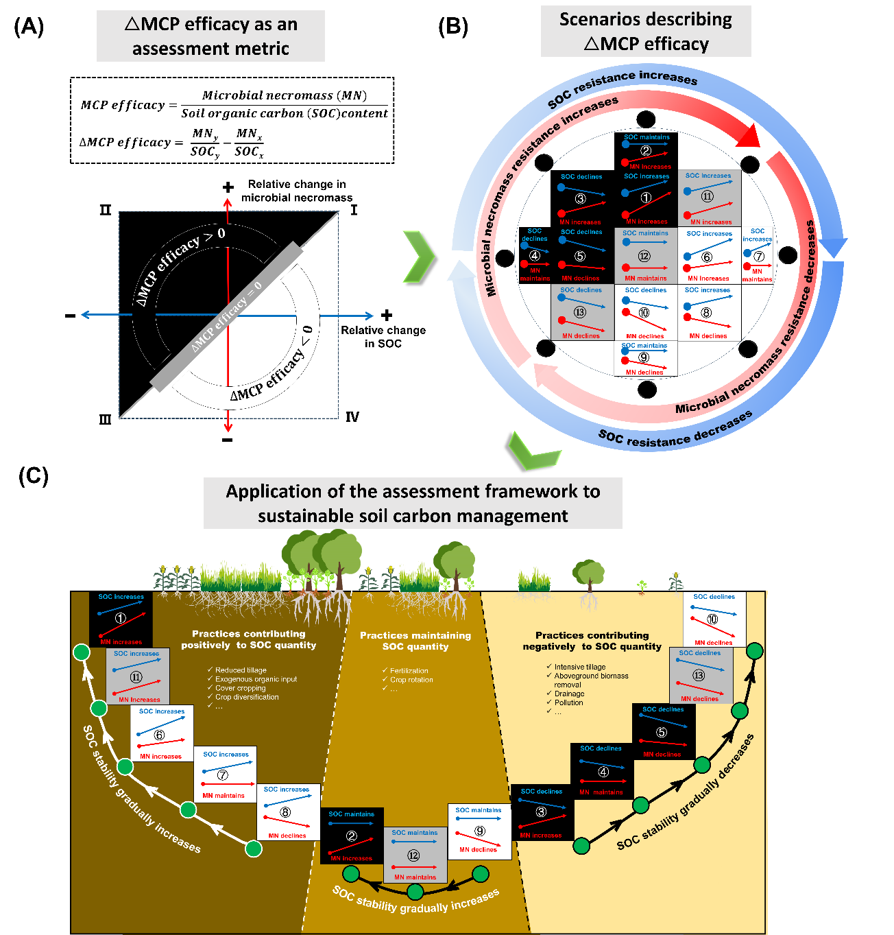 中国科学院沈阳应用生态研究所研究团队基于土壤MCP过程的三阶段框架:反应(Reaction)- 行为(Behavior)- 效应(Effect),聚焦其长期固碳效应(Effect),提出关键指标“△MCP能效(△MCP efficacy)”。该指标基于土壤微生物残体与SOC变化速率之间的相对差异,刻画了两者的同步或异步变化。研究团队据此构建了涵盖13种相对变化组合的全情景MCP功能评价体系,并进一步提出,在土壤碳增汇实践中,仅追求SOC量“增不增”可能产生误判;为保障长期效益,更应在此基础上关注SOC“稳不稳”。本研究提出的以土壤微生物残体和SOC同/异步动态(△MCP能效)为核心的土壤MCP功能评价体系,将碳库的“量”与“稳态”置于同一标尺上进行综合衡量:△MCP能效为正时(△MCP能效 > 0),表征微生物残体对SOC的相对贡献提升,意味着更高的碳库稳定性与抗扰动潜力(微生物残体主导的稳定碳库比例增加);△MCP能效为负时(△MCP能效 < 0),则提示非微生物来源碳占比上升或微生物残体碳周转加快,需警惕碳库“只增量、不稳定”的风险(积累更多易分解、不稳定的碳)。