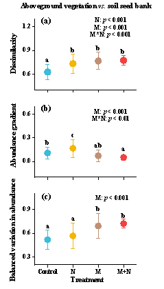图 1 氮添加与刈割处理对地上植被与土壤种子库之间的(a)组成相异性,(b)丰度梯度变化以及(c)丰度平衡变化的影响。
