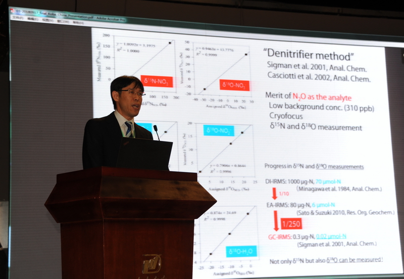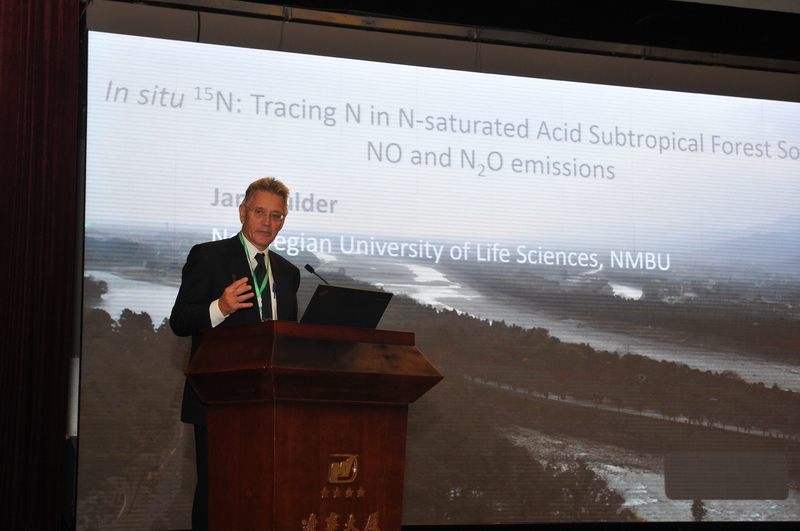 随后来自挪威生命科学大学、布朗大学、新罕布什尔大学、京都大学、东京工业大学、格里菲斯大学、悉尼大学、丹麦哥本哈根大学、中国科学技术大学、中国海洋大学、厦门大学、中国科学院安徽光学精密机械研究所、西南大学、中国科学院华南植物园、华南农业大学、中国农业大学、加利福尼亚大学圣克鲁兹分校等单位的19位特邀专家作大会特邀报告;其中来自挪威生命科学大学的Jan Moulder 教授作了题为“Using in situ 15N to trace NO and N2O emissions from N-saturated, acid forest soils in Southwest China”的报告;来自布朗大学的Meredith Hastings教授作了题为“Investigating the isotopic composition of reactive nitrogen compounds in the atmosphere: new methods and applications”的报告;来自东京工业大学的Mang Lin博士作了题为“Use of radioactive isotopes to understand stable isotope effects for tracking the evolution of planetary atmospheres and origin or life”的报告;来自格里菲斯大学的Zhihong Xu教授作了题为“Complex and dynamic effects of climate change and local environment on carbon and nitrogen cycling in different terrestrial ecosystems”的报告;来自新罕布什尔大学的Erik Hobbie教授作了题为“Nitrogen and carbon sources and supply in agricultural weeds and in mycorrhizal fungi”的报告;来自京都大学的Keisuke Koba教授作了题为 “Nitrogen and oxygen isotope tracers to study nitrogen recycling in grasslands” 的报告。