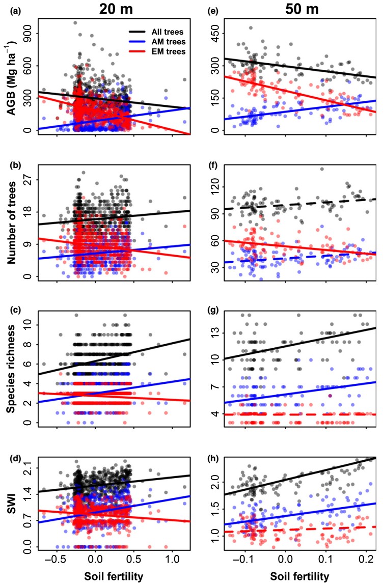 鉴于此,中国科学院沈阳应用生态研究所天然林生态组的博士生毛子昆,在导师王绪高研究员的指导下,与哥伦比亚罗萨里奥大学和美国加州大学的研究人员进行合作,基于长白山25ha阔叶红松林样地的大树(DBH ≥ 10 cm)和土壤数据,运用空间分析方法,分析了菌根类型和土壤养分等对群落多样性和地上生物量的作用。研究发现,AM树种和EM树种与土壤养分条件的关系存在差异,且AM树种主要影响群落多样性,而EM树种主要影响群落生物量,进而导致群落多样性和生物量随土壤肥力呈现相反的变化趋势(图1)。研究结果揭示了土壤养分和菌根真菌在温带森林群落结构形成过程中的主导作用,阐释了树种菌根类型调控森林群落结构的潜在机制(图2)。