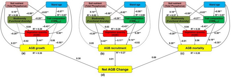 图1.多重生物和非生物因子影响温带森林树木地上生物量生长(a)、更新(b)、死亡(c)和净变化量(d)的直接和间接影响