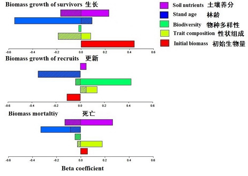 图2.多个驱动力对树木生长、更新和死亡的相对影响(填充的直方图表示该因子的直接影响,带斜纹的直方图表示其间接作用)