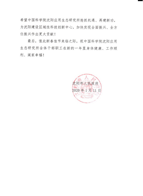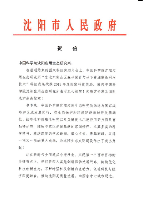 2020年1月11日,沈阳市人民政府发来贺信,向我所荣获2019年度国家科技进步二等奖表示衷心祝贺,向获奖专家级团队表示崇高敬意,对我所为沈阳生态文明建设作出的贡献予以肯定,并希望我所抢抓机遇,再建新功,为沈阳建设区域性科技创新中心,实现全面振兴作出更大贡献。