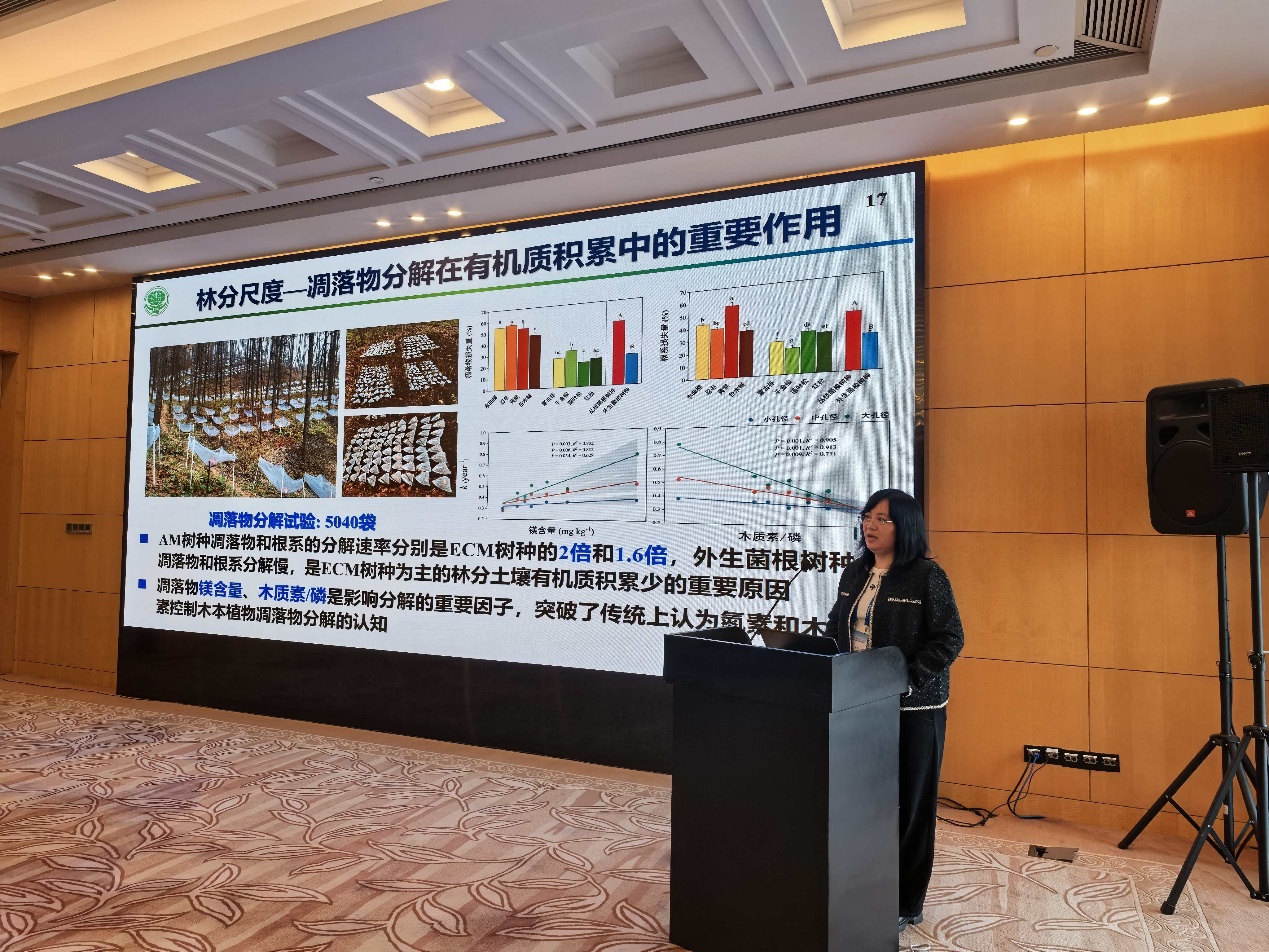 沈阳生态所朱教君院士、研究员,杨凯研究员和高添研究员召集组织了“森林生态与保育——基于气候智慧林业的森林保育”分会场。分会场由孙涛研究员和高添研究员主持,共设14个口头报告。其中,沈阳生态所杨健研究员、孙涛研究员、杨凯研究员、中国科学院地理科学与资源研究所马泽清研究员、福建师范大学吴福忠教授分别作“激光雷达技术助力森林景观结构、功能、与动态研究”“根系直径对分解速率的影响:全球尺度水平”“温带森林植物-土壤反馈与有机质维持机制”“根系养分获取策略与森林生产力”“亚热带森林转换改变土壤动物对凋落物分解的作用-Smart Fairies in Soil”的主旨报告。高添研究员和滕德雄博士分别作“森林反照率和碳汇对气候变化的影响:基于清原科尔塔群的综合效应评估”“地形复杂度量化及其在涡度通量观测中的应用”报告。其他来自浙江农林大学、中国林业科学研究院、中国农业大学、南京林业大学和福建省林业科学研究院等科研同行作了精彩报告。与会专家同行及研究生之间对报告展开了深度交流、讨论,取得了预期成果。
