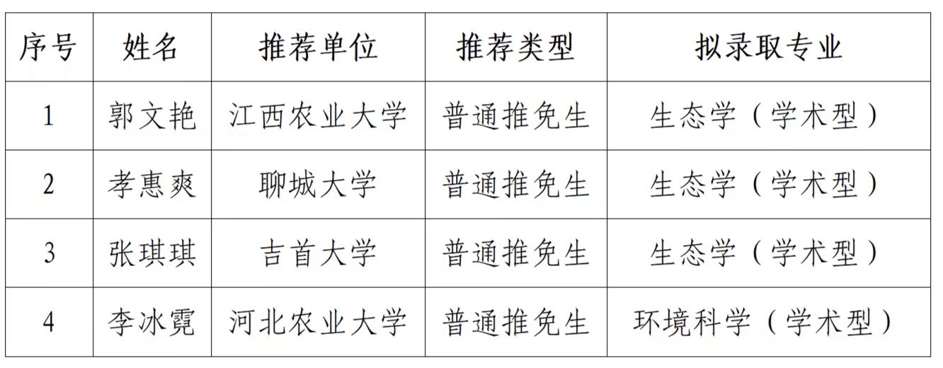 经过我所招生委员会复试通过,同意拟录取以下四名同学为中国科学院沈阳应用生态研究所2024年免试推荐硕士研究生,现以公示:公示期为2023年10月23日-2023年10月29日。