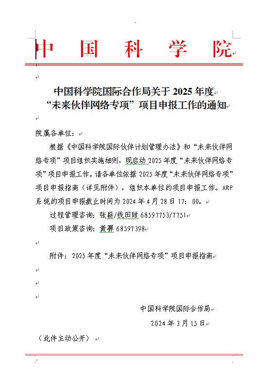 根据《中国科学院国际伙伴计划管理办法》和“未来伙伴网络专项”项目组织实施细则,现启动2025年度“未来伙伴网络专项”征集工作。请大家依据“未来伙伴网络专项”申报指南(详见附件),积极申报。所内截止申报时间是2024年4月19日
