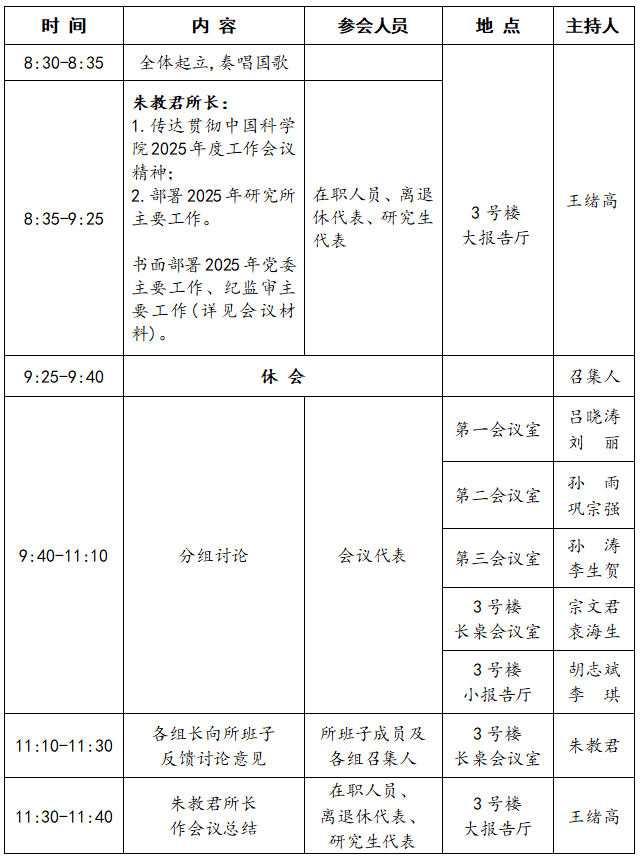 为深入学习贯彻中国科学院2025年度工作会议精神,以抢占科技制高点为目标,全面部署2025年度工作,所班子决定3月4日召开研究所工作会议暨职工代表大会,具体通知如下: