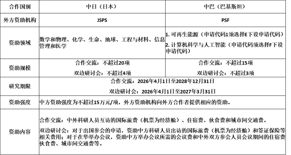 根据国家自然科学基金委员会(NSFC)与日本学术振兴会(JSPS)、巴基斯坦科学基金会(PSF)的合作协议及后续达成的共识,2026年度自然科学基金委与上述资助机构将分别共同资助中日、中巴合作交流与双边研讨会项目。