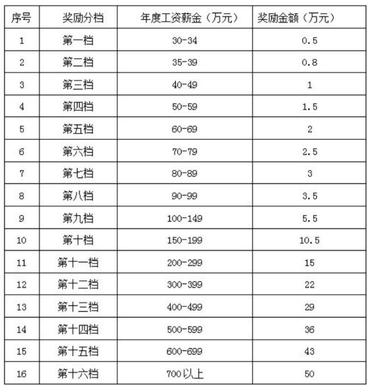 按照人才年度工资薪金,人才贡献专项奖励分为16档,奖励标准详见下表:
