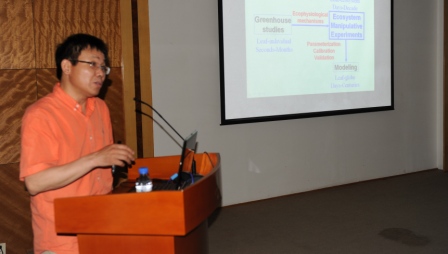 报告会由韩兴国研究员主持,首先由河南大学万师强教授做了题为“利用控制实验研究气候变化与温带草原关系”的报告。万师强教授详细阐述了CO2浓度增加、增温和放牧等因素对温带草原生态系统碳循环的影响,并展示了由他设计并主持的大型气候变化实验(多伦全球变化多因子实验)的多项研究成果,同时还介绍了其研究团队在施肥、风蚀、凋落物等因素对温带草原影响方面的最新研究进展和大量独到的发现与成果。