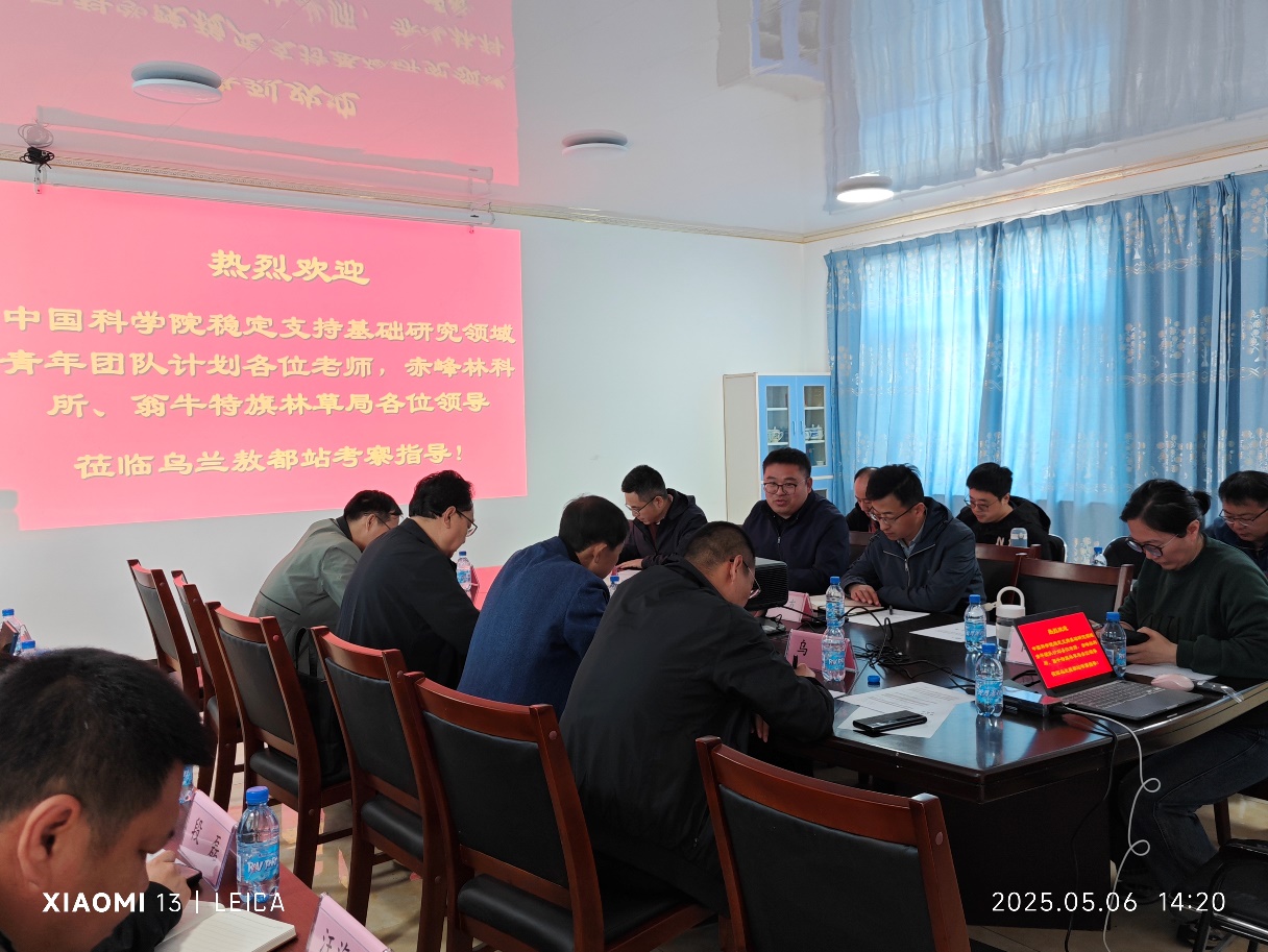 5月6日,青年团队负责人孙涛研究员与团队核心骨干成员10余人赴乌兰敖都荒漠化防治生态试验站(简称:乌兰敖都站)开展考察活动,与乌兰敖都站、赤峰市林业科学研究所、翁牛特旗林业和草原局相关领导和科研人员进行座谈和工作对接,并实地考察科尔沁沙地困难立地现状。赤峰市林业科学研究所党委书记马晓军、所长于海蛟、正高级工程师李显玉,翁牛特旗林业和草原局副局长乌华、治沙站站长汪海洋,乌兰敖都站站长闫巧玲、副站长周全来、余海滨工程师,以及在站开展工作的科研人员和研究生等30余人参加了座谈和系列考察活动。孙涛介绍了青年团队计划和本次调研活动的目的,并简要汇报了项目的基本情况。闫巧玲从建站历程、研究方向和主要科研任务等方面,详细汇报了实验站的发展概况和研究特色;并介绍,乌兰敖都站自1975年建站以来,一直聚焦荒漠化防治工作,拥有近50年的大气、土壤、水分、植被监测数据,以及不同类型沙丘、丘间低地等困难立地类型,可为青年团队项目的顺利实施提供科技支撑。
