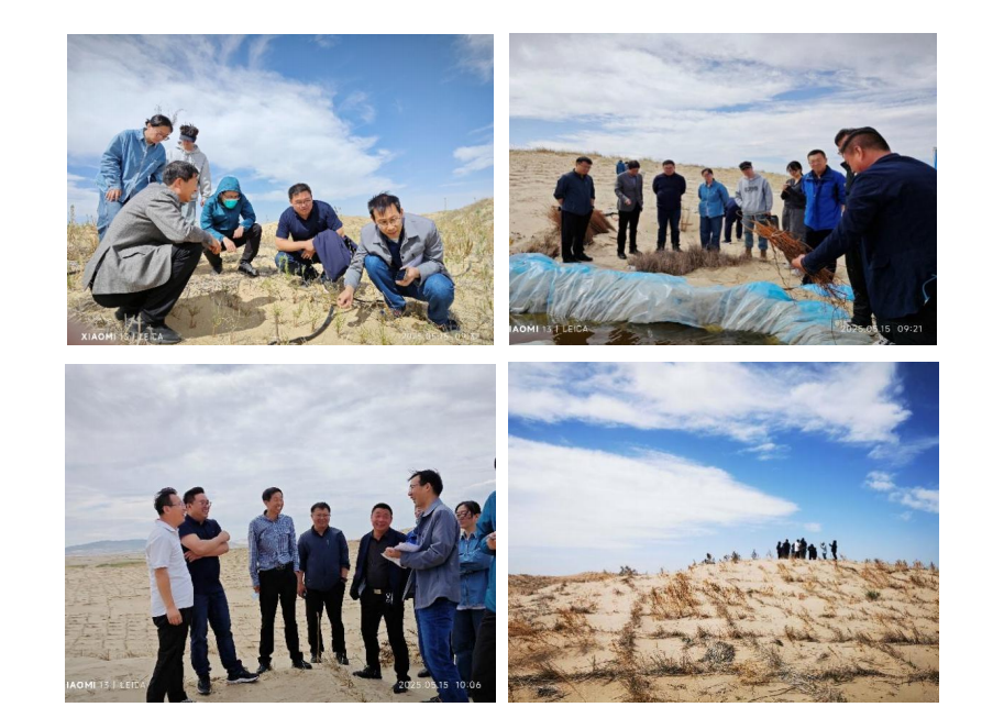 5月14日至15日,基于前期调研和讨论,孙涛研究员与项目组骨干成8名成员,联合赤峰市林业科学研究所所长于海蛟、正高级工程师李显玉等4名专家,再次赴赤峰其白线穿沙公路治沙样地开展实地考察,明确了项目植被构建的具体实验地块,确定了拟开展的具体植被构建模式,配置原则:根系互补(深根与浅根),功能协同(豆科与非豆科、内生菌根菌与外生菌根菌),抗逆性优先(先锋物种),空间层次性(立体配置)和经济性(经济种兼顾)。期间,调研组还参观了赤峰市林业科学研究所及当地育苗基地,就拟栽植的灌木和乔木品种选择进行了深入交流和探讨。