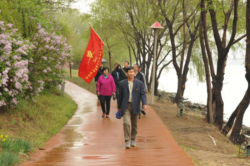 徒步活动以五里河公园内沈阳市标志性建筑——盛京大剧院为起点,在鲜红所旗的引领下,徒步队伍沿着景色秀丽的浑河滨水慢道一路向前,大家步伐矫健,精神昂扬。蒙蒙细雨中的五里河公园里鲜翠欲滴,花香四溢,更是为活动增色不少。大家一路欣赏美景,一路笑语欢歌。活动结束后,同志们纷纷与浑河美景、健步达人冠军墙合影留念。