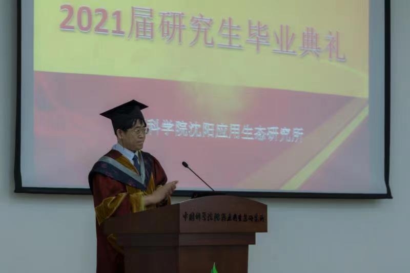 典礼最后,所长朱教君致辞,他首先对2021年度毕业的全体同学表示祝贺,对他们在学术上取得的优异成绩表示肯定,对他们在学期间对沈阳应用生态所所做出的贡献表示感谢。他表示,学生生活的结束并不是学习的终结,而是新的学习生活的开始,他希望同学们树立终身学习的理念,在学习中获取前进的力量,,要做一个有责任有担当的人,在广阔的社会实践中创造人生的辉煌。并对在学的研究生提出了更高的要求,希望他们向顺利毕业的师兄师姐们看齐,在规定的时间内完成学业及科研工作,用更好地成绩去回报研究所、回报社会。