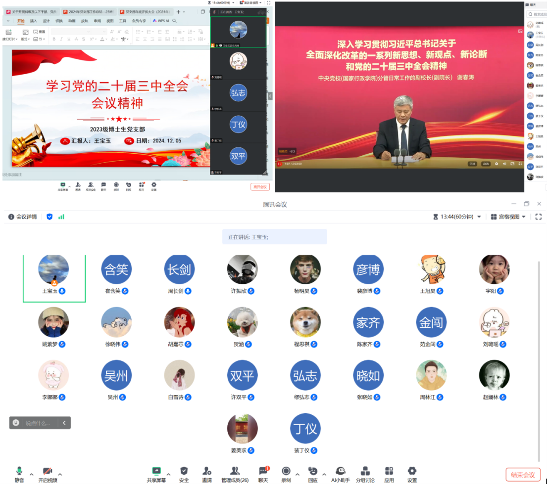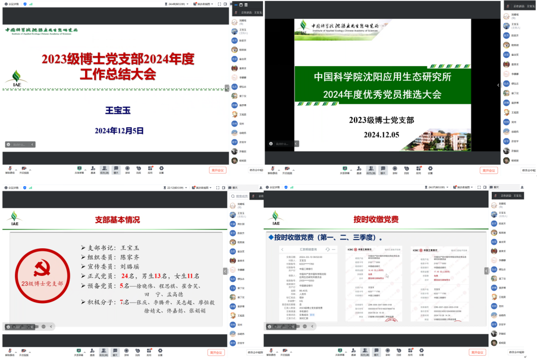 为深入学习贯彻党的二十届三中全会精神,强化党员理论武装,提升个人理论素养和党性修养。按照党群办公室的工作安排,沈阳生态所23级博士党支部于2024年12月05日通过线上形式学习党的二十届三中全会精神并开展支部2024年度工作总结。支部书记王宝玉主持会议。