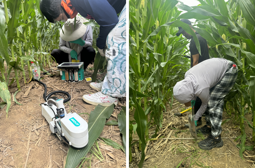 科研团队人员仔细查看玉米抽雄吐丝期的长势情况,认真记录玉米植株的株高、叶绿素含量、光合作用参数等信息。同时,仔细排查玉米植株病虫害迹象以及田间杂草情况,一旦发现潜在风险,立即制定针对性防控策略。同时,分土层采集土壤样品,监测玉米关键生育期土壤水分、养分状况,结合近期的气象数据与土壤墒情监测结果,来综合评估玉米当前的生长态势与主要模式应用效果,为准确反演作物产量奠定基础。