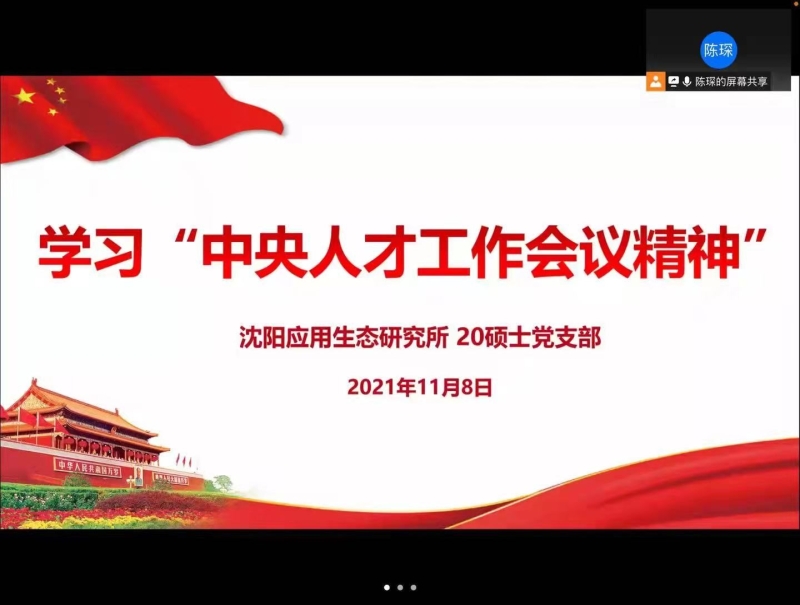 2021年11月8日,沈阳应用生态研究所2020级硕士党支部通过腾讯会议召开“学习中央人才工作会议精神”主题党日活动。支部党员以及部分发展对象、积极分子、入党申请人通过线上参会,支部书记陈琛主持会议。