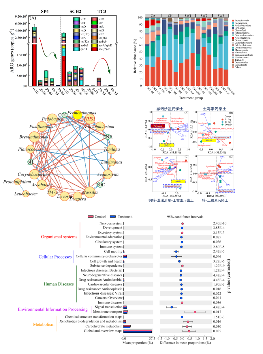 鉴于此,中国科学院沈阳应用生态研究所“环境生态工程创新组群”以辽宁省典型畜禽养殖场地污染土壤为研究对象,分析了畜禽养殖场地重金属、抗生素及抗性基因的迁移机制,评估了畜禽养殖污染导致的生态风险,建立了一种新型草螺菌-菌糠生物炭土壤修复材料,实现了低温条件下畜禽养殖场地重金属-抗生素复合污染土壤高效修复。利用高通量测序和基因芯片等技术,阐明了草螺菌与土著微生物对土壤重金属、抗生素及其诱导的抗性基因的削减机制,明晰了环境因子与微生物群落在土壤修复过程中的相互关系,加深了对生物炭基微生物材料修复重金属-抗生素复合污染土壤作用机制的理解。上述材料已被应用于辽宁省鞍山市岫岩县及海城市禽养殖场地污染土壤修复示范工作中。