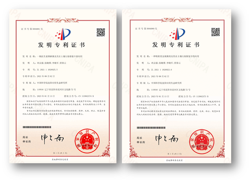 基于开发的菌剂及复合材料,获得了2项发明专利(2023)授权,为复合污染农田土壤修复提供有力技术支撑。巩宗强研究员为第一发明人,特别研究助理张晓蓉博士为第二发明人。