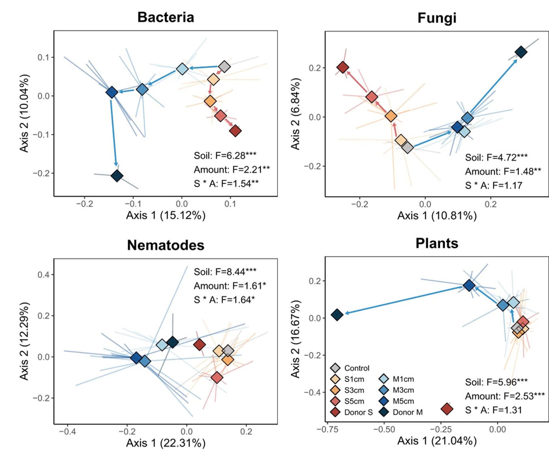 基于此,中国科学院沈阳应用生态研究所研究团队,依托额尔古纳森林草原过渡带生态系统研究站,采用土壤接种的方法,探讨了不同剂量和不同类型土壤接种对退化草地植物、土壤生物及生态系统功能恢复的影响。研究发现,接种草甸草原和林草交错带的土壤通过引入有利于退化草地恢复的关键土壤生物,促进了退化草地生态系统功能的恢复。