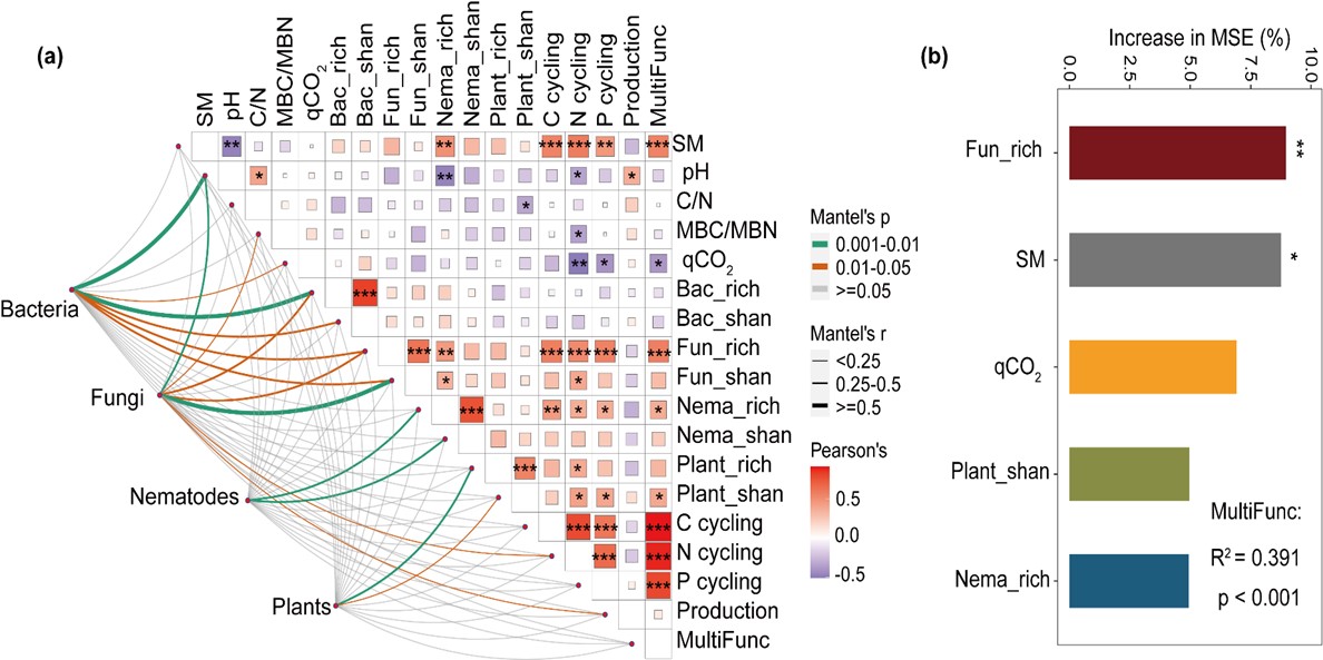 土壤接种后显著提高了生态系统的多功能性,且土壤接种剂量的增加促进了生态系统功能的提升,对比荷兰的土壤接种试验也发现了一致的结果。其中,真菌群落的变化是生态系统多功能性变化的主要预测因子。上述研究揭示了土壤生物介导的植物-土壤反馈在退化草地恢复中的作用机制,对于优化退化草地近自然恢复措施,实现退化草地可持续利用具有重要意义。