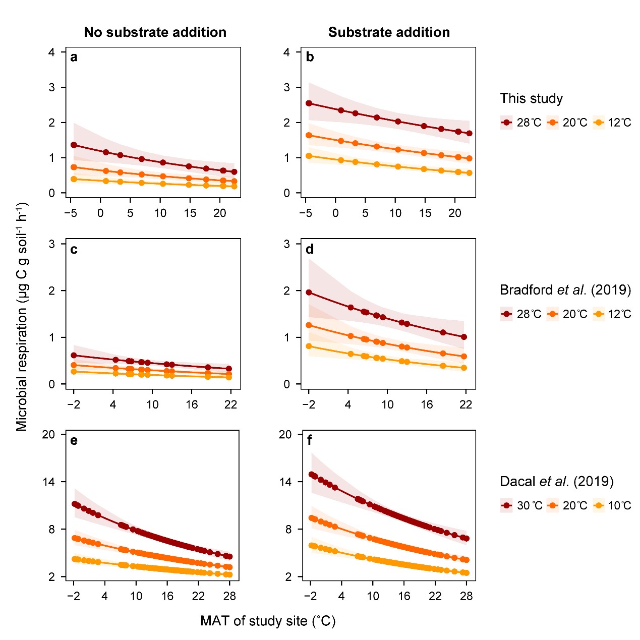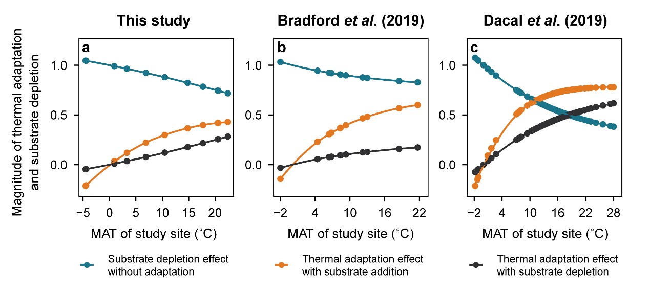 沈阳应用生态研究所生物地球化学组,以中国东部南北分布的11个森林土壤为研究对象,设置底物添加(仅热适应)和不添加底物(热适应+底物限制)两种处理,并在12°C、20°C、28 °C下测定微生物呼吸速率,利用数值模型解析底物和微生物热适应性对呼吸速率的影响(图1),研究结果表明:年平均气温较高的地区,微生物补偿性热适应对微生物呼吸的负效应更强(图2);微生物热适应对微生物呼吸的影响随着底物可利用性升高而增强(图3);利用两个全球尺度的数据库结合本研究建立的模型发现,土壤底物与热适应性对微生物呼吸的影响具有全球普遍性。上述成果为在土壤碳循环模型中考虑微生物热适应效应提供了研究思路。