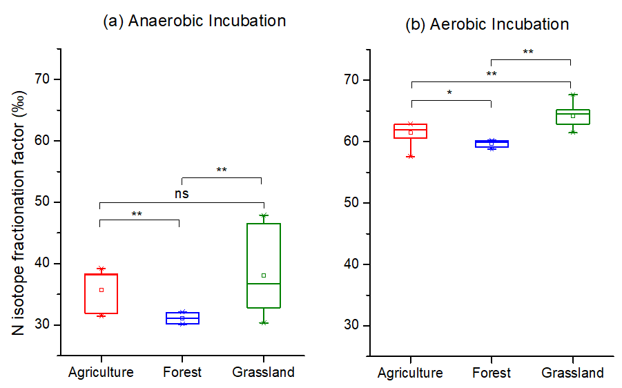 图2. 厌氧和有氧条件下,不同生态系统土壤产生NO过程的N同位素分馏系数