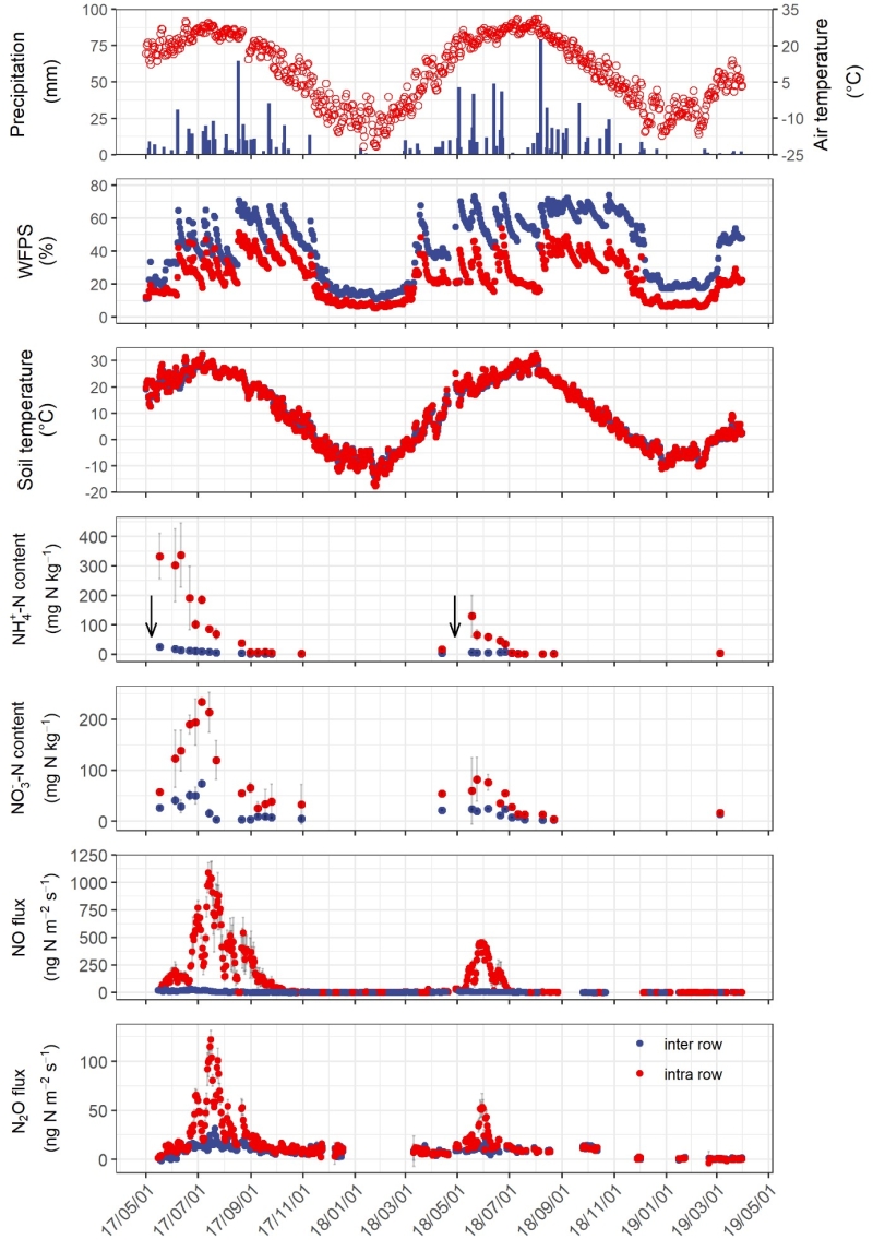 基于此,中科院沈阳应用生态研究所稳定同位素生态学团队在辽宁沈阳农田生态系统国家野外观测研究站建立了高频率连续同步测定土壤N2O和NO排放速率的自动采样和测定系统(图1),对该站点玉米旱田土壤N2O和NO的排放通量进行了连续两年的观测(2017 - 2019)。研究发现,在第一年,NO和N2O的排放量分别为8.9和2.4 kg N ha-1,分别占氮肥施用量的5.9%和1.5%;第二年为2.3 和1.8 kg N ha-1,分别占氮肥施用量的1.9%和1.2%。排放的年际差别主要受施肥后降雨量和分配差异的影响,第一年排放较高与施肥后长时间干旱有关。生长季内,土壤NO和N2O的排放呈现相同的季节动态(图2),主要受土壤温度和无机氮含量的控制。此外,该研究还发现春季冻融过程产生的NO和N2O对全年NO和N2O的贡献非常有限。该研究指出气候变化(比如干旱)可能增加该区域旱作农田土壤氮素的气态损失(尤其是NO);长期和高分辨率的观测有助于更好地了解NO和N2O排放速率的昼夜、季节和年际变化。研究结果有助于加深对农田土壤气态氮损失及其控制因素的理解。