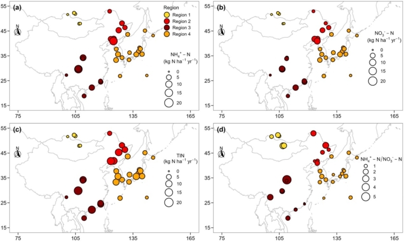 图2 东北亚区域38个站点年度氮沉降格局(NH4+-N, NO3--N, TIN,NH4+-N/NO3--N ratio)。38个站点包括东北区域7个森林站点(图强TQ,五营WY,桦南HN,帽儿山MES,清原QY,沈阳SY,宽甸KD,来自NECAD监测网络,同位素组建立,Region 2)和EANET网络中的31个站点(详情见论文)